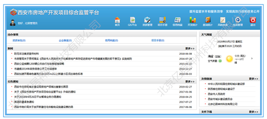在西安市住房和城乡建设局指导下,为提高房地产开发行业管理水平,推行政务透明和政务公开,提高办事效率,实现对市场主体和房地产开发项目的有效监管,组织开发了《西安市房地产开发项目综合监管平台》目前平台已在西安市全面应用,涵盖市级用户10个、县级用户100个、企业用户3000个、系统上线以来,获得了一致好评。
